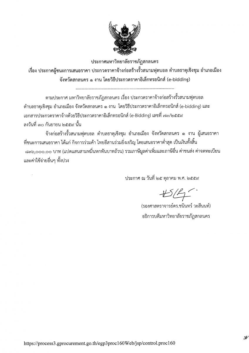 ประกาศผู้ชนะการเสนอราคา ประกวดราคาจ้างก่อสร้างรั้วสนามฟุตบอล ตำบลธาตุเชิงชุม อำเภอเมือง จังหวัดสกลนคร 1 งาน โดยวิธีประกวดราคาอิเล็กทรอนิกส์ (e-bidding) เลขที่ 73/2559